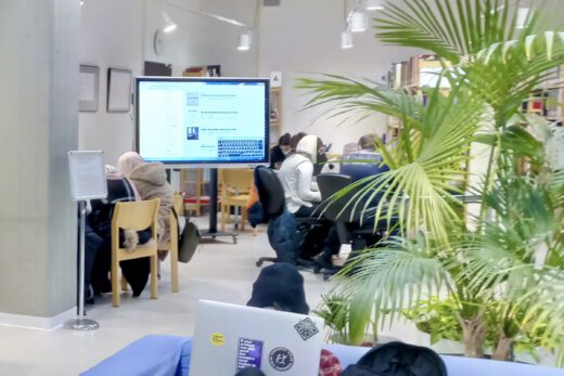 v.l._ Julia von Randow, stellv. Leiterin der Schulen im Lette Verein Berlin, Petra Madyda, Direktorin der Stiftung Lette Verein, Michael Hentschel, Abteilungsleiter Ausbildung Grafikdesign, Angelika Schöttler, Bezirksbürgermeisterin Tempelhof-Schöneberg, Dr. Gertrud Schröder und Sofia Hankel vom „Quartier Bayerischer Platz e.V.“